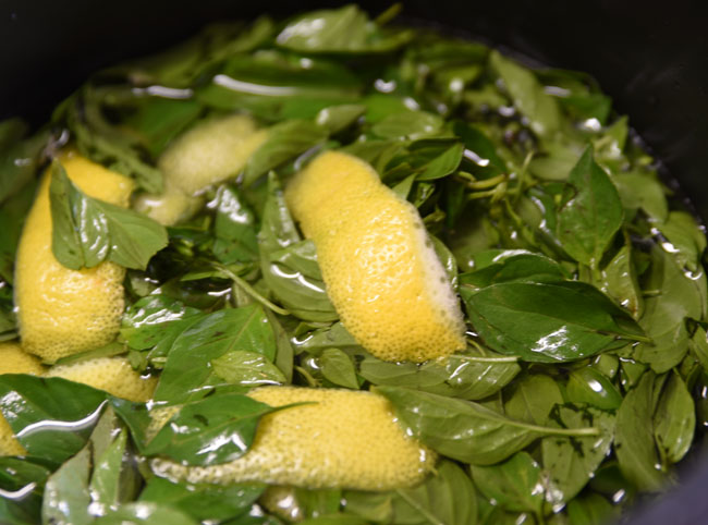 •Garnish: fresh basil sprigs (lemon basil if you can find it); lemon zest strips