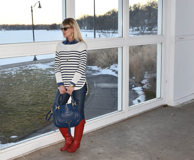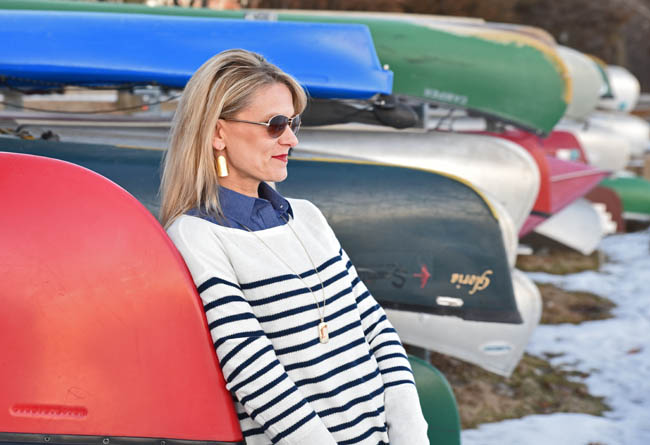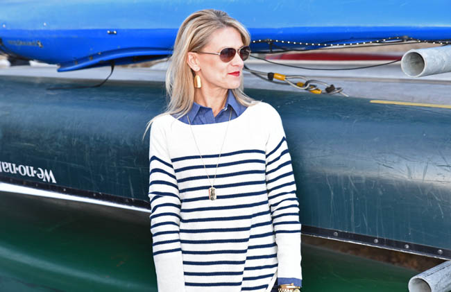 I suppose the nautical look is timeless in many ways, but there has been a heavy fashion emphasis on the style over the last few years, and the trend seems like it’s continuing with the early spring looks hitting the stores. I love that the style is holding strong, as it’s one of my favorite looks. Across the spectrum of my closet you’ll see clothes with navy and white stripes, from some of the oldest pieces (a Tory Burch dress that I treated myself to when I first started at the law firm ages ago) to the most recent – this sweater just purchased.