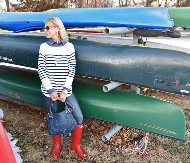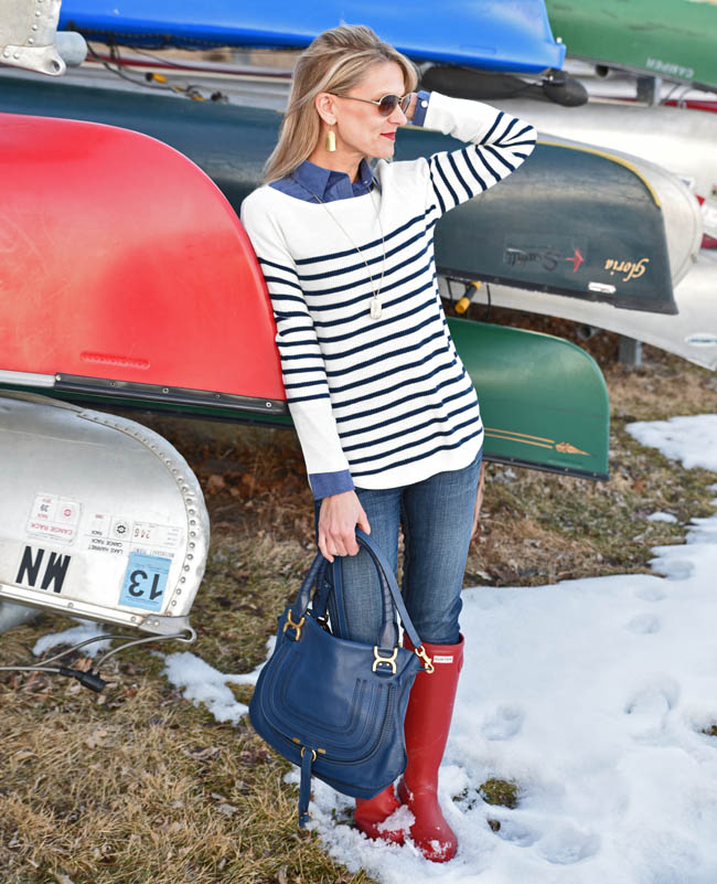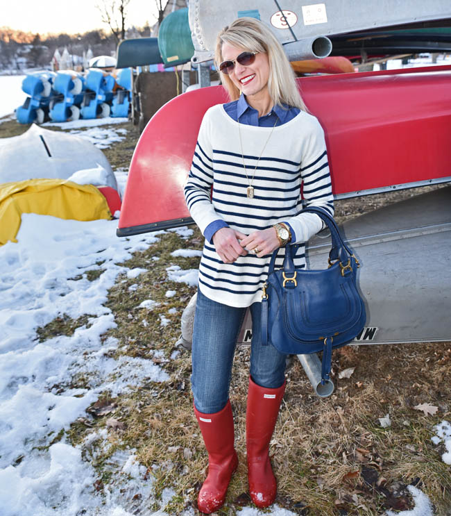 Banana Republic sweater, shirt and pendant | Hudson jeans | Hunter boots | Tory Burch sunglasses | Chloe handbag | Anthropologie earrings | Michael Kors watch | Madewell bracelet