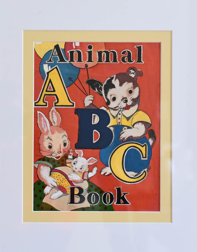 My mom purchased this Animal ABC Book (circa 1935) almost 40 years ago, being drawn to Milo Winter’s artwork. The book was in really rough shape (see photo below of the back cover), having been well-loved, with almost every page having the scribbling handiwork of some child long ago. There was one page that was still pristine and it happened to have the letters J and K on it. Her plan was to frame the picture for my room when I was a little girl (my maiden name is Jensen). However, the colors never worked out so the book remained unused. Recently, she decided to refurbish the front cover by painting it with acrylic paints – a twist on the paint by number approach, if you will – mixing colors to match what was depicted on the cover or in some cases, going a different direction by changing the color and pattern (note the mommy bunny’s dress in the first picture compared to the others). The effort created a super cute piece to frame, perfect for our playroom.