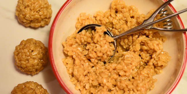I like to use an ice cream scoop to mold the peanut butter balls – makes the size uniform and helps with the sticky mess on your hands.
