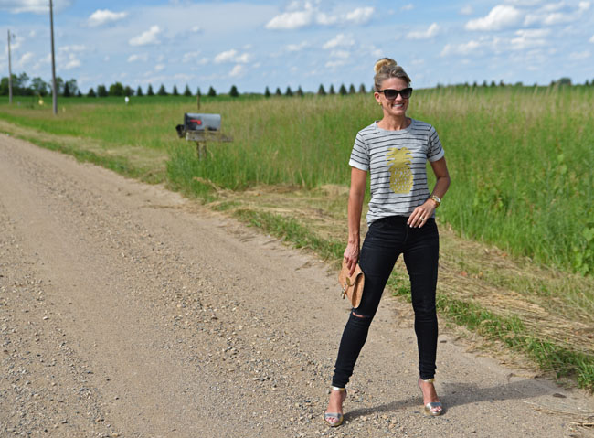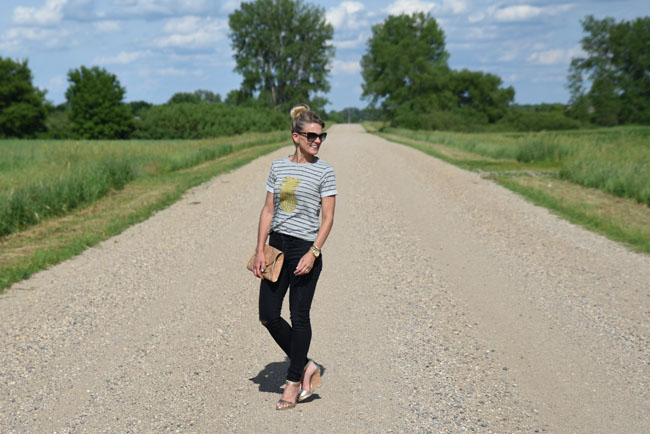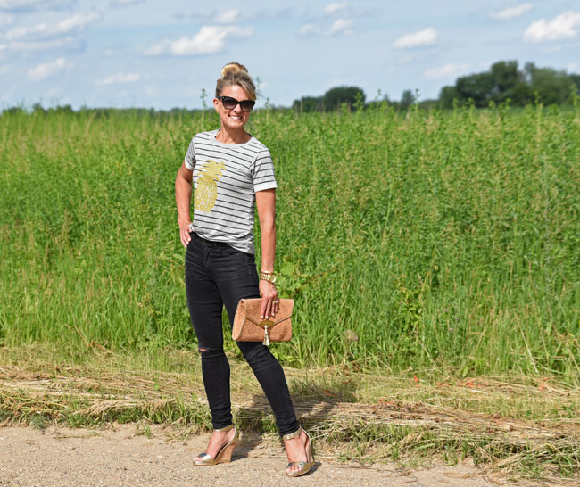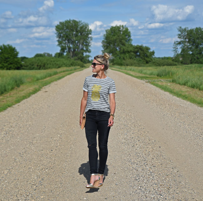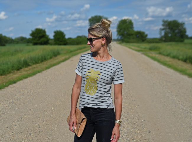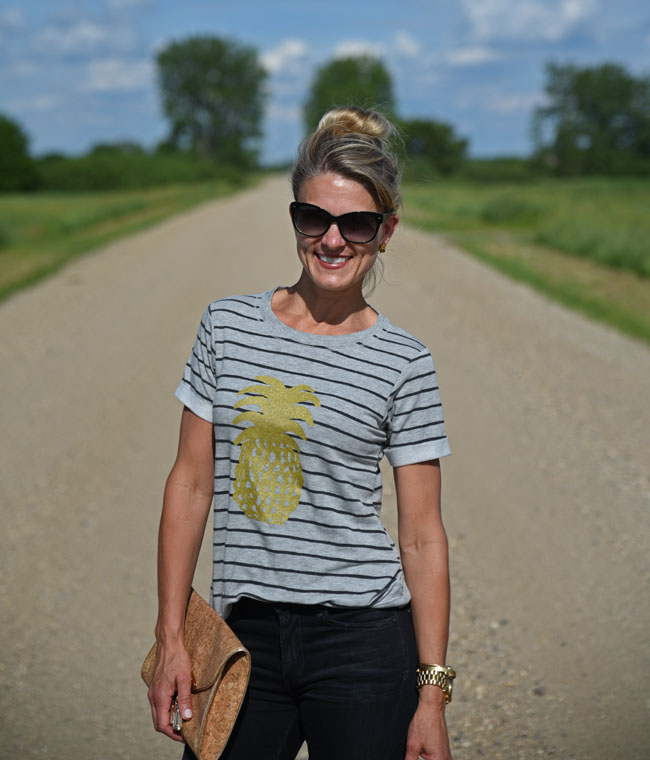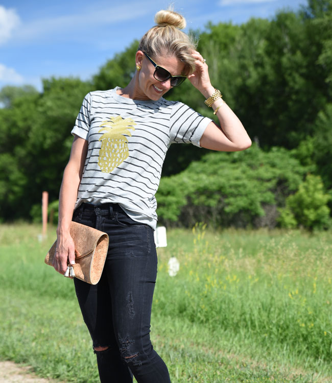 Pineapples have definitely been an “it” print this spring, but for the most part in our house they have shown up only on clothes for the kiddos. Tory Burch had some darling options (see some included in sidebar) but I worried that the print was a little too limiting for that price point. But this top caught my eye online, and when I received it and realized it had sweatshirt kind of feel, it quickly has become a favorite (and now on sale!).