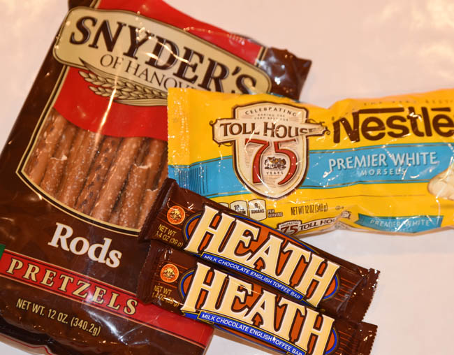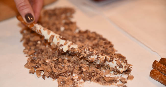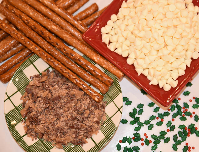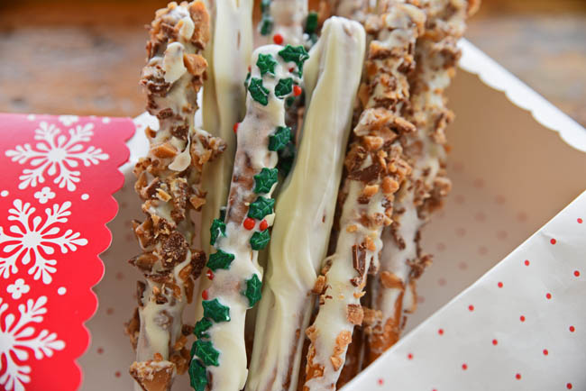 Melt white chocolate in microwave safe bowl in 30 minute increments – stirring between each session. Do not get impatient and over heat all at once.  Have your toppings spread out parchment or waxed paper all ready to go.  Spread chocolate on all sides of the pretzel rod leaving just a few inches from the bottom for a handle. It works best to spread from the bottom to the top. Roll immediately in toppings and place on parchment paper to set.
