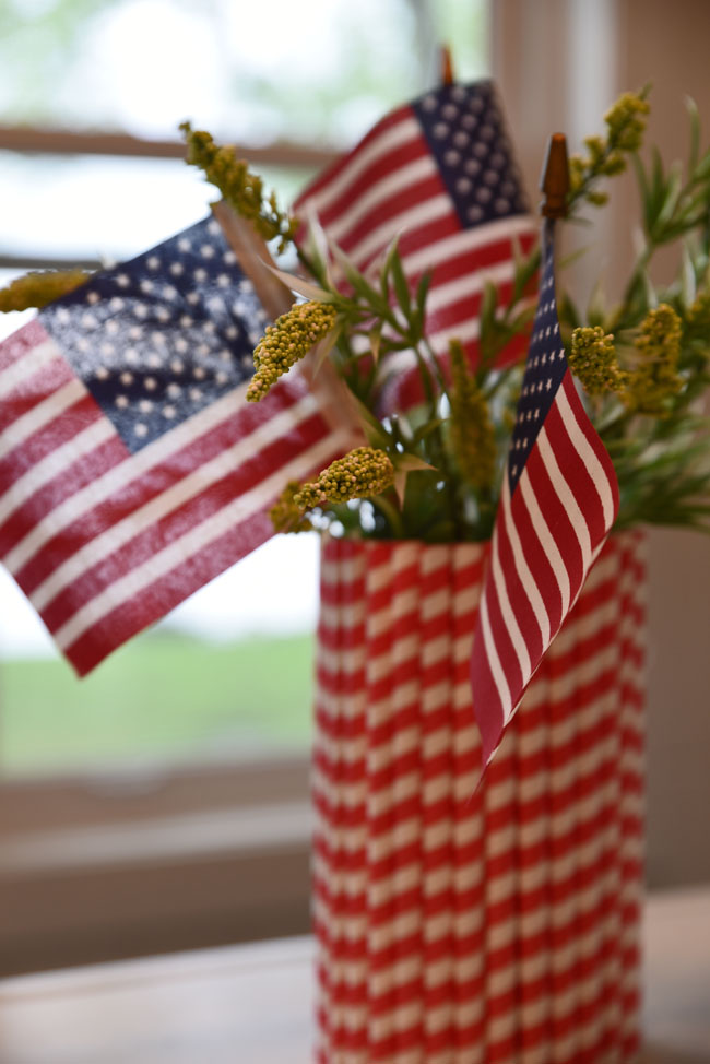Need a splash of holiday décor for this weekend? Here’s a fun centerpiece idea, using only a couple of materials – easy, quick and inexpensive! The red and white stripes are perfect for the 4th of July holiday, but will work well throughout the summer and could be incorporated into winter decorating as well. What brings to mind a flag’s stripes one season just as easily can remind us of candy canes in another!