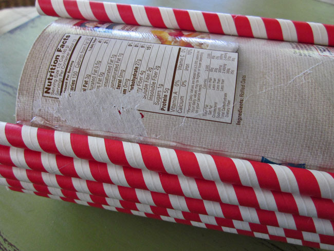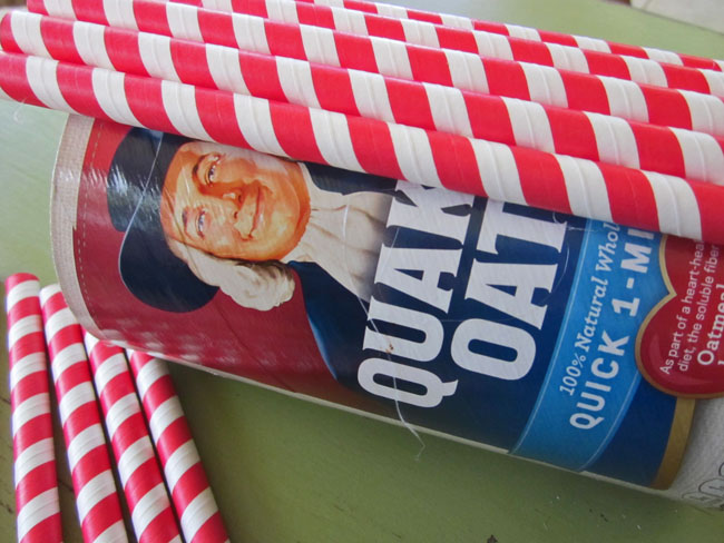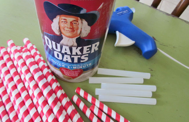 Materials: Empty oats container, paper straws (these were from Crate and Barrel, but are widely available) and a hot glue gun.