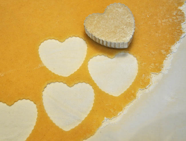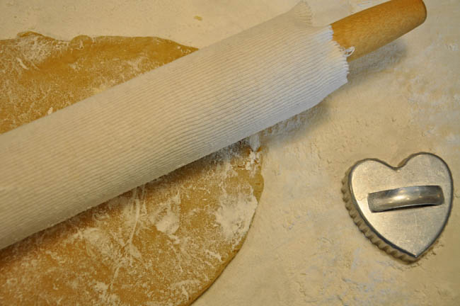 Baking tips: Using the pastry cloth helps a great deal when rolling out the cookies. Also, if you have time, allow your cookie sheet to cool before putting in the next round. Putting cookies onto a warm cookie sheet will impact the cooking time and overall appearance of the cookies (ever wonder why some batches come out darker than others?).