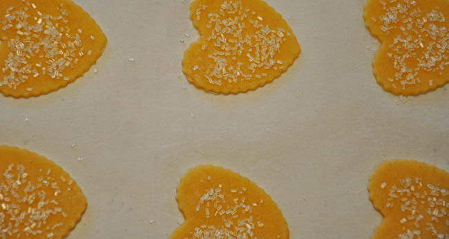 Dust a pastry cloth (here is the one unique thing I referred to in the intro paragraph) with a layer of flour. With a rolling pin roll each ball into a circle approximately 12 in. diameter x 1/8 in. thick. If you have trouble with the cookie cutter sticking, dipping it in flour before each use will help. Top with sanding sugar (which will not melt in the oven and adds a nice sparkle and texture). Bake cookies on ungreased cookie sheet 8-11 minutes or until cookies are lightly browned. Watch the baking time carefully, and make sure to adjust if you don’t let the pan cool between each batch (as noted below).