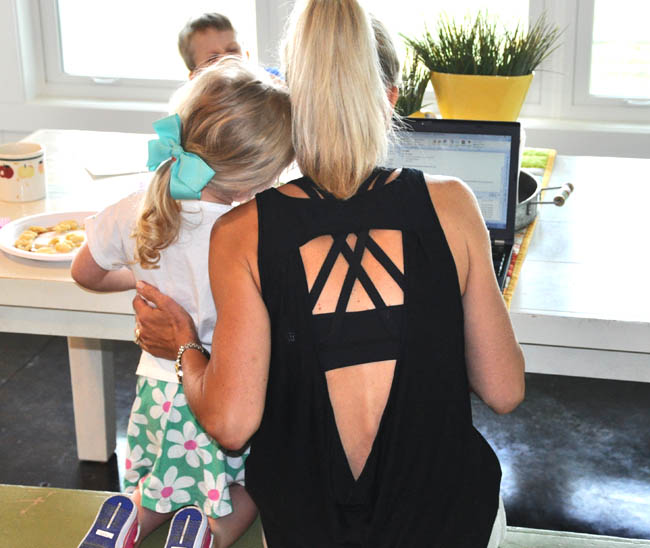 Lululemon shorts and tops | Target flip flops | Tory Burch sunglasses and earrings