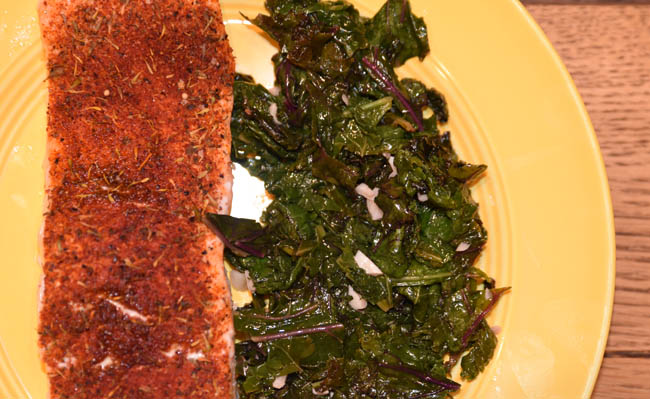 Reality Check. Okay, so I didn’t actually cook the salmon or the kale for this post, but I DID take good notes and pictures while Sara did. I’m confident I can pull it off, just as soon as that yummy spice rub arrives.