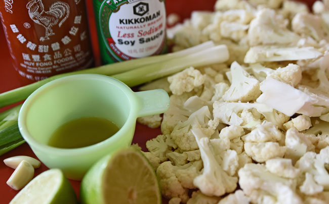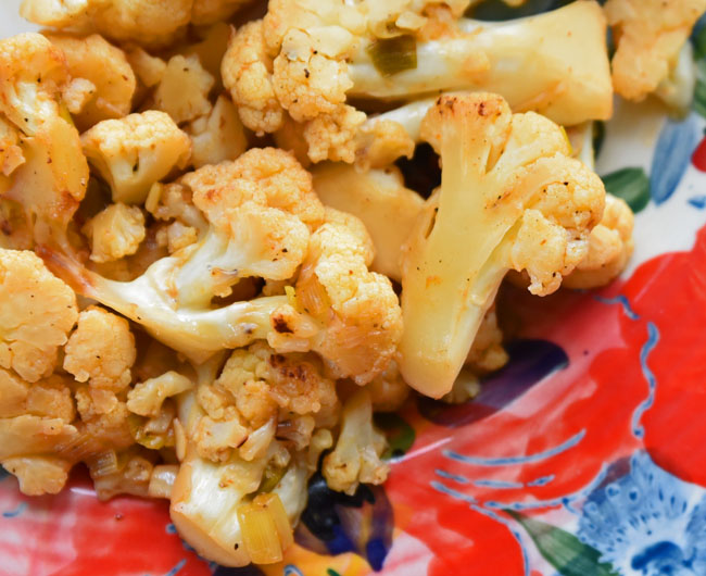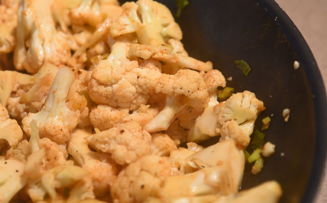 Heat a large, heavy skillet over medium-high to high heat. Add the oil, then the cauliflower. After about 2 minutes of stirring the cauliflower continuously, add the garlic and cook (while stirring) for another minute or two (until some pieces are nicely browned), then turn the heat to low.
