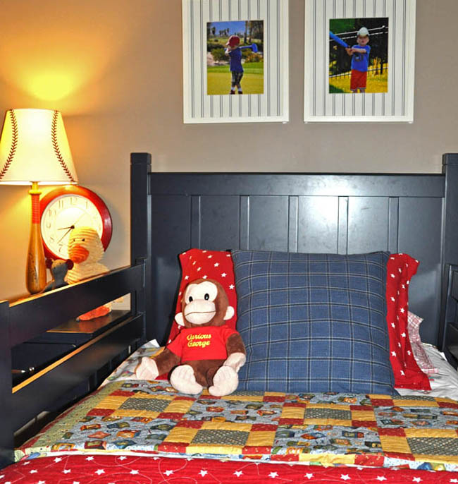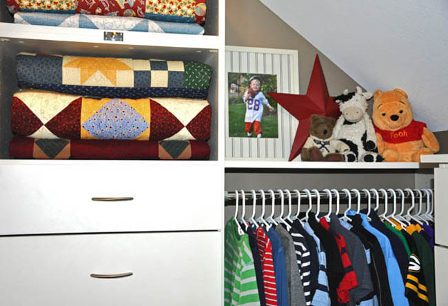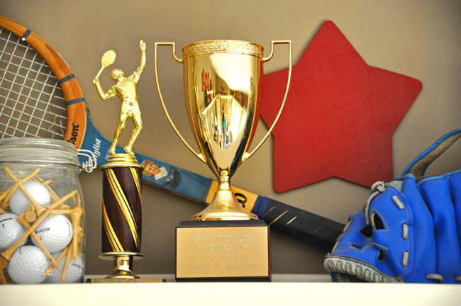 When Ella was on her way, we needed to convert the guest room to her nursery. We made the decision to keep Taylor in his same room, to try and minimize the crazy amount of changes coming with the arrival of a new babe. But that meant she was getting the bigger room and bigger closet. I worried that I was teeing up a sibling argument right off the bat, so I wanted to find a couple of ways to make special the room change from baby to big boy. Although, now, after knowing Miss E’s personality, we would have been in a world of hurt had we not given her the bigger room and closet. I also wanted to think of a design that would last for several years. Character-themed rooms, no matter how fun, can be risky. Those of you with young kids know that what is their “absolute favorite” can differ from one week to the next (and that applies to food, clothes and superheroes).  You can put together a pretty spectacular Batman room, and have Spiderman become much cooler before the Pottery Barn Kids bill arrives. DSC_0176_edited-1 The shelf lines the perimeter of T’s room.  It’s nice and high (probably about 3 feet from the ceiling – less in some areas, as the ceiling is sloped), which is ideal for keeping out of kids’ reach and therefore keeping organized. The trophies are from Taylor’s grandpa, uncle and mommy (me – just in case that’s not clear). Some big advantages to using these in Taylor’s room: