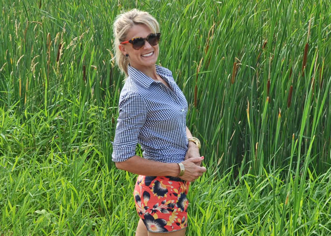 Pairing short shorts with a midriff-showing, pattern mixing top is absolutely NOT a realistic look for me, but I loved how the checked pattern of the shirt was repeated in the small piping at the bottom of the shorts. It seemed too stuffy and awkward to wear the shirt tucked in, which was my original plan. The repeat is subtle. The outfit, not so much.