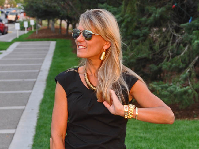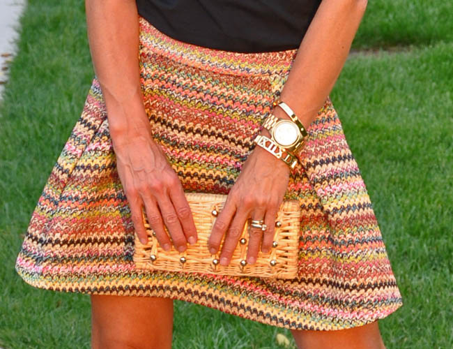 Ann Taylor shirt | Skirt and bracelets from Melly, not available online | Banana Republic shoes (now on sale) | Kate Spade clutch | Tiffany & Co. sunglasses | Anthropologie earrings and necklace | Michael Kors watch