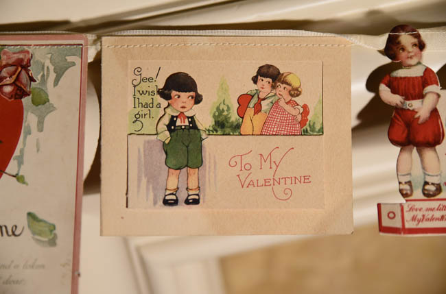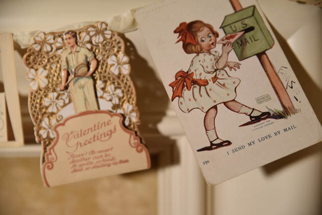 In early February of last year I walked into my parents’ house and immediately noticed the darling decoration she had hung from the mantle. She had made a garland with antique Valentine’s Day cards stitched onto ribbon. It was simple and sweet, just a tiny touch of themed décor for the holiday. It’s tough to muster up the energy to decorate immediately on the heels of a couple of months heavy with holiday décor, but adding just a little something singular can have big impact.
