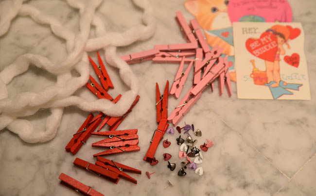 DSC_4124_edited-1DSC_4138_edited-2Based on other posts you may know that my sewing machine is still in the box, but there are other cute ways you can attach the cards, such as these mini clothes pins or heart shaped brads. The stitching adds more weight and may make the garland easier to drape if using ribbon, but using thick yarn could give you that affect without the sewing.